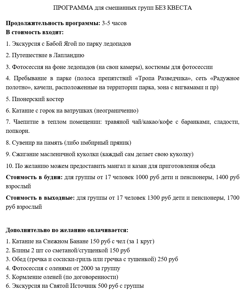 Так как в выходные очень много народу, поэтому за школьниками будет сложно уследить. А еще в будни весь парк, можно сказать, принадлежит группе, и больше возможностей и свободы)Также обратите внимание, мы не принимаем много групп. У нас нет необъятного потока людей. Каждую группу мы принимаем как долгожданных гостей, уделяем максимум внимания каждому человеку. Аниматоры — это все наши герои, настоящие)) Если хотите приглашенных ведущих с профессиональным звуком и пр — то это будет за дополнительную плату (добавится стоимость их услуг).Группы в выходные дни участвуют во всех наших мероприятиях, поэтому отдельно квест им не проводим.По всем вопросам пишите в сообщения группы или звоните Александре 288 54 04 или 8902 80 70 607.