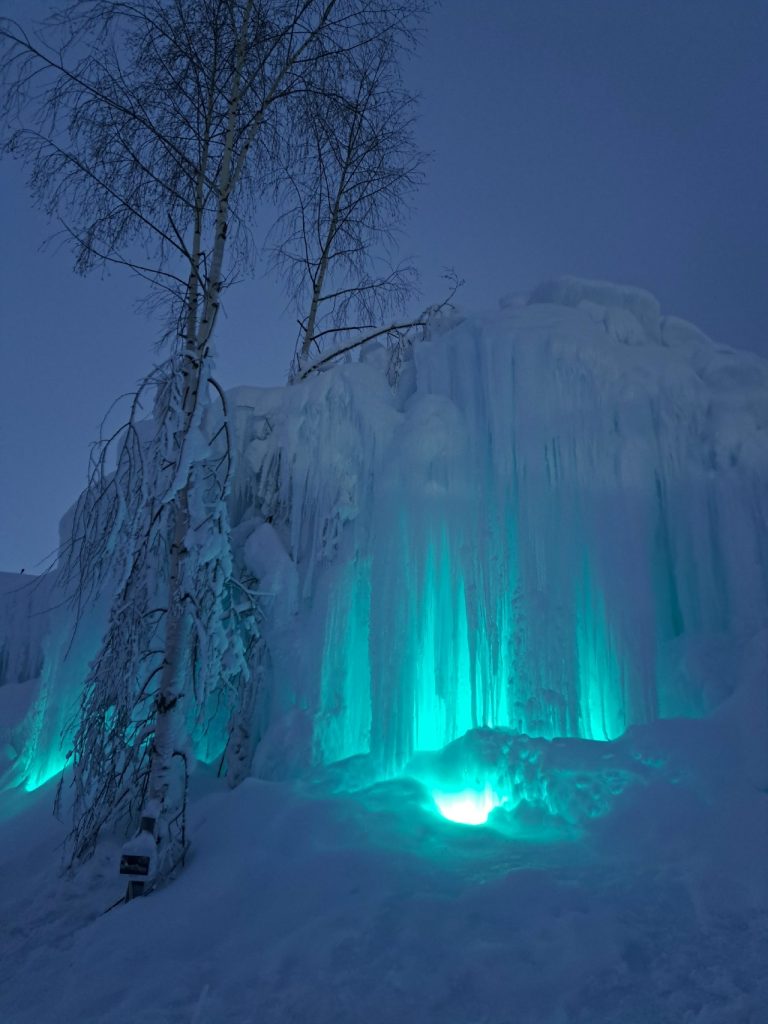 Самый частый вопрос: когда лучше всего приехать на Ледопады? Приезжать нужно днем! Пофотографироваться при свете, пока видно лица. Потом можно прогуляться до «Лапландии», перекусить в кафе бабы Яги, с горок покататься.
